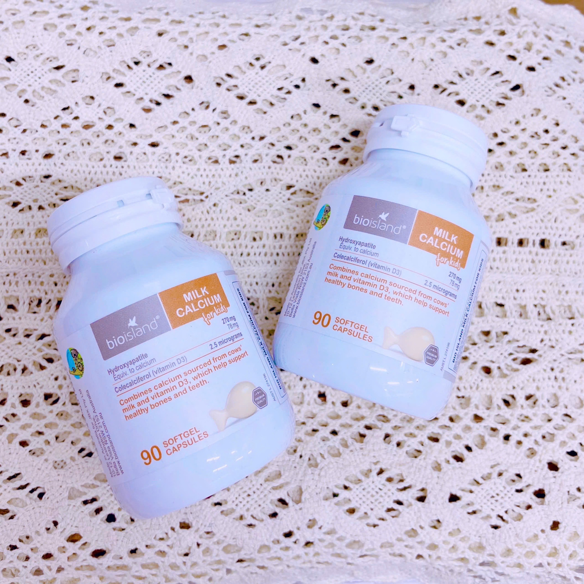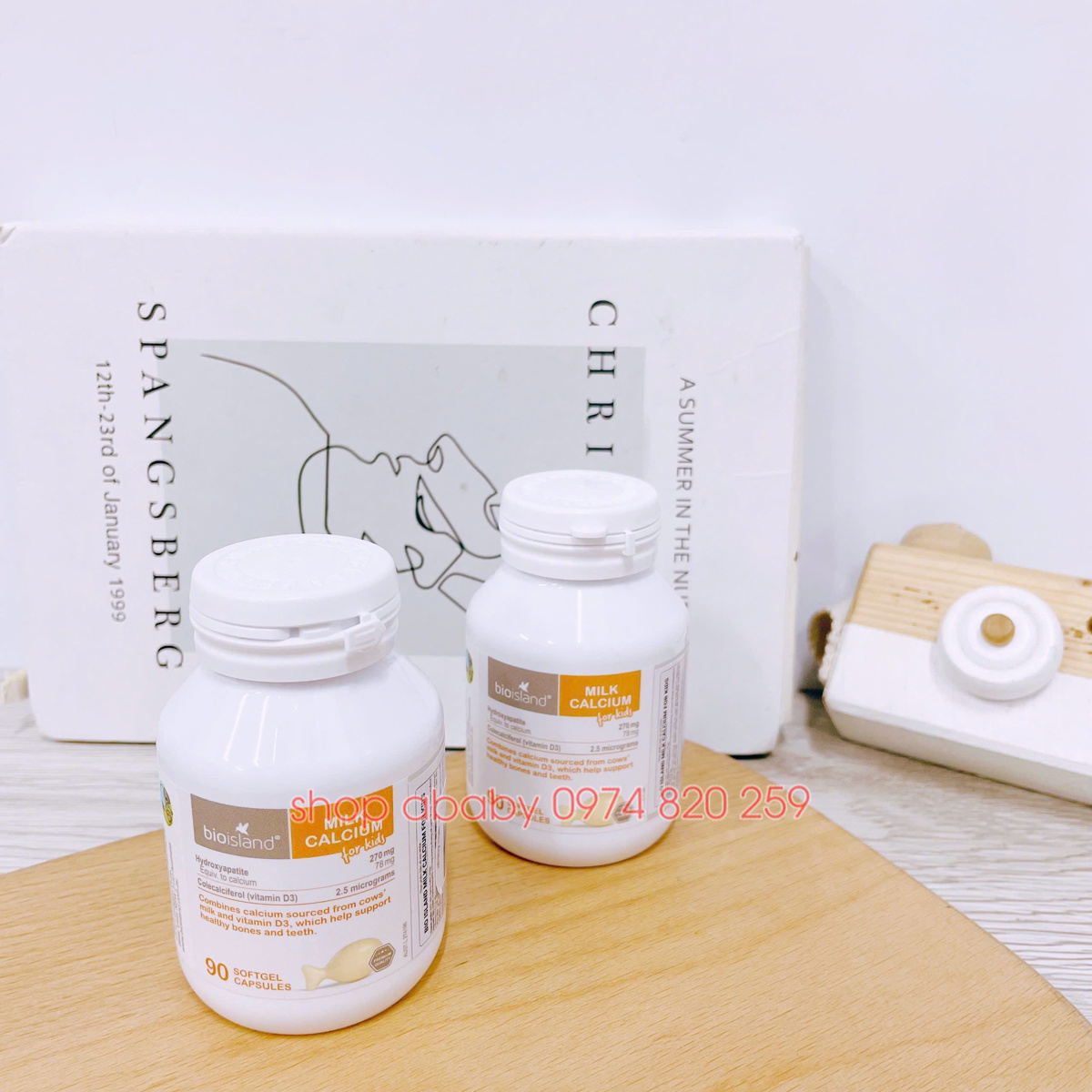 Bio island milk calcium 90 viên, dạng viên nang mềm, màu trắng đục, đựng trong lọ nhựa