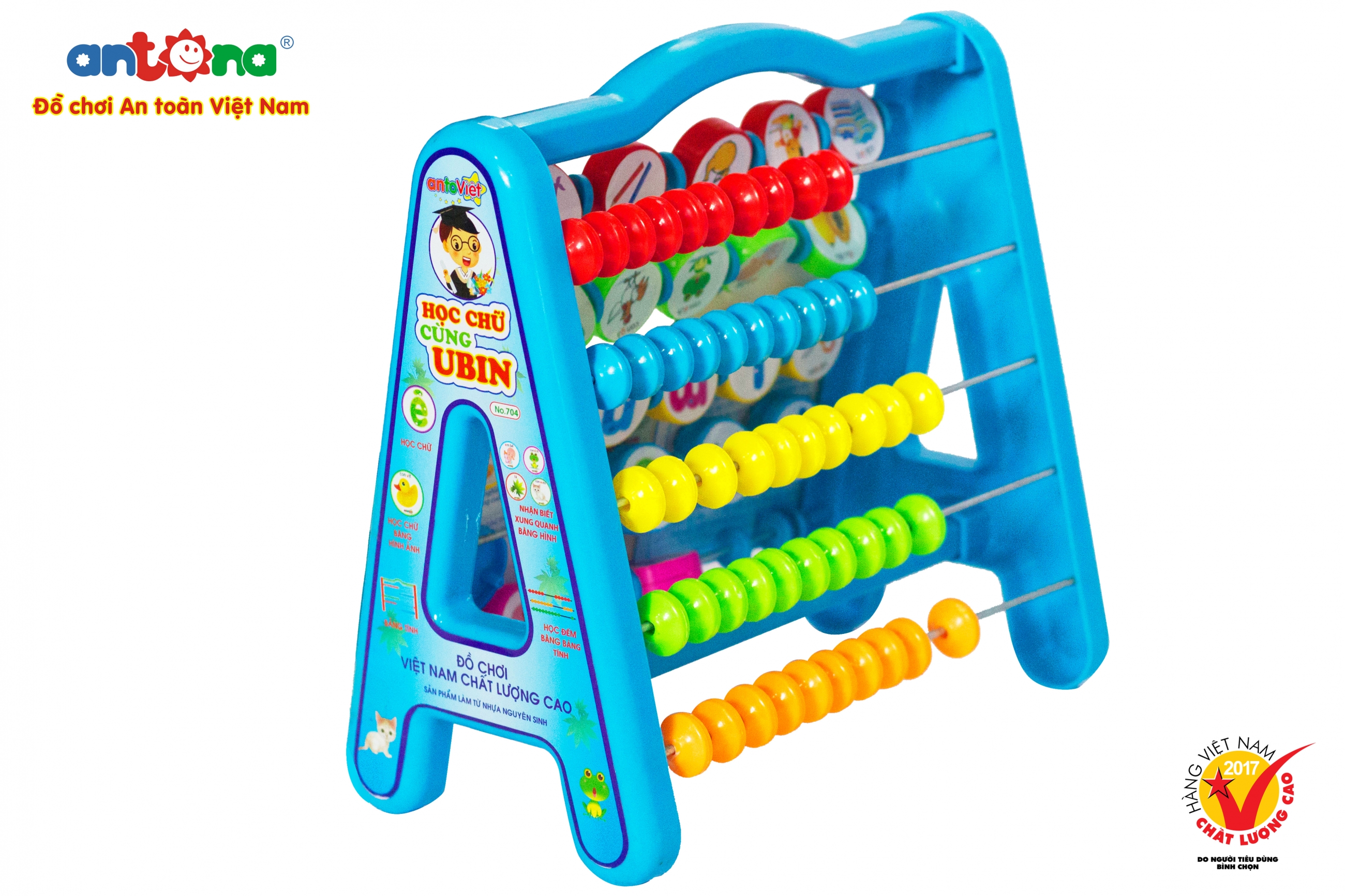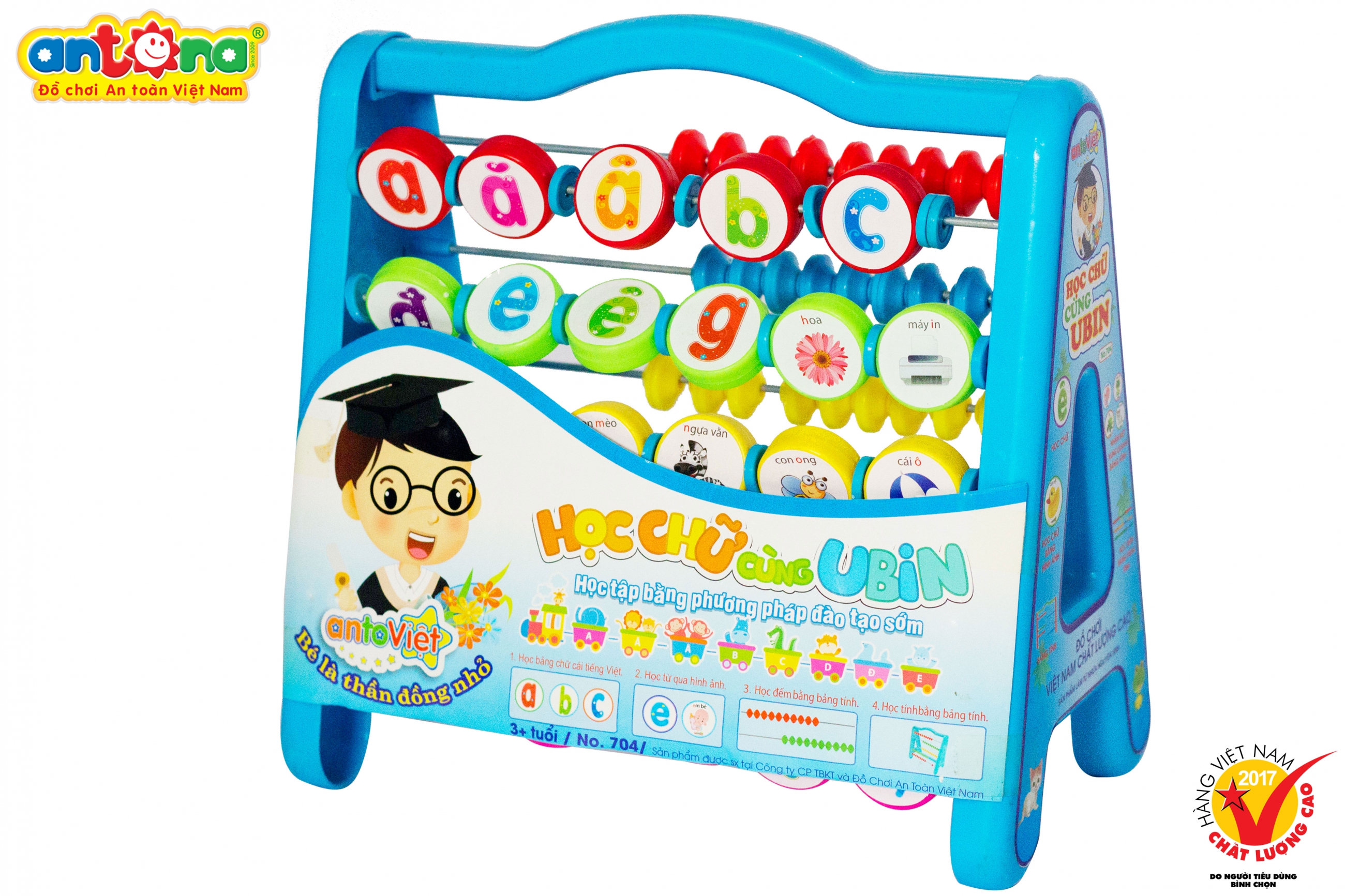 Sản phẩm là một khung chữ A với 29 ô chữ thường - hình ảnh, 1 ô dấu và 50 con tính được chia vào 10 hàng khác nhau trên bảng tính. Bé sẽ bắt đầu bằng việc học các chữ cái, chữ cái thông qua hình ảnh. Ở mặt đầu tiên của khung chữ A, bé sẽ học 29 chữ cái của bảng chữ cái tiếng việt cùng với hình ảnh. Ở mặt thứ 2, bé sẽ học làm toán với bảng tính, giúp bé không còn phụ thuộc vào máy tính với cá phép tính đơn giản. Bé sẽ được học tất cả những kiến thức và kỹ năng cơ bản cần thiết nhất trước khi tới trường.