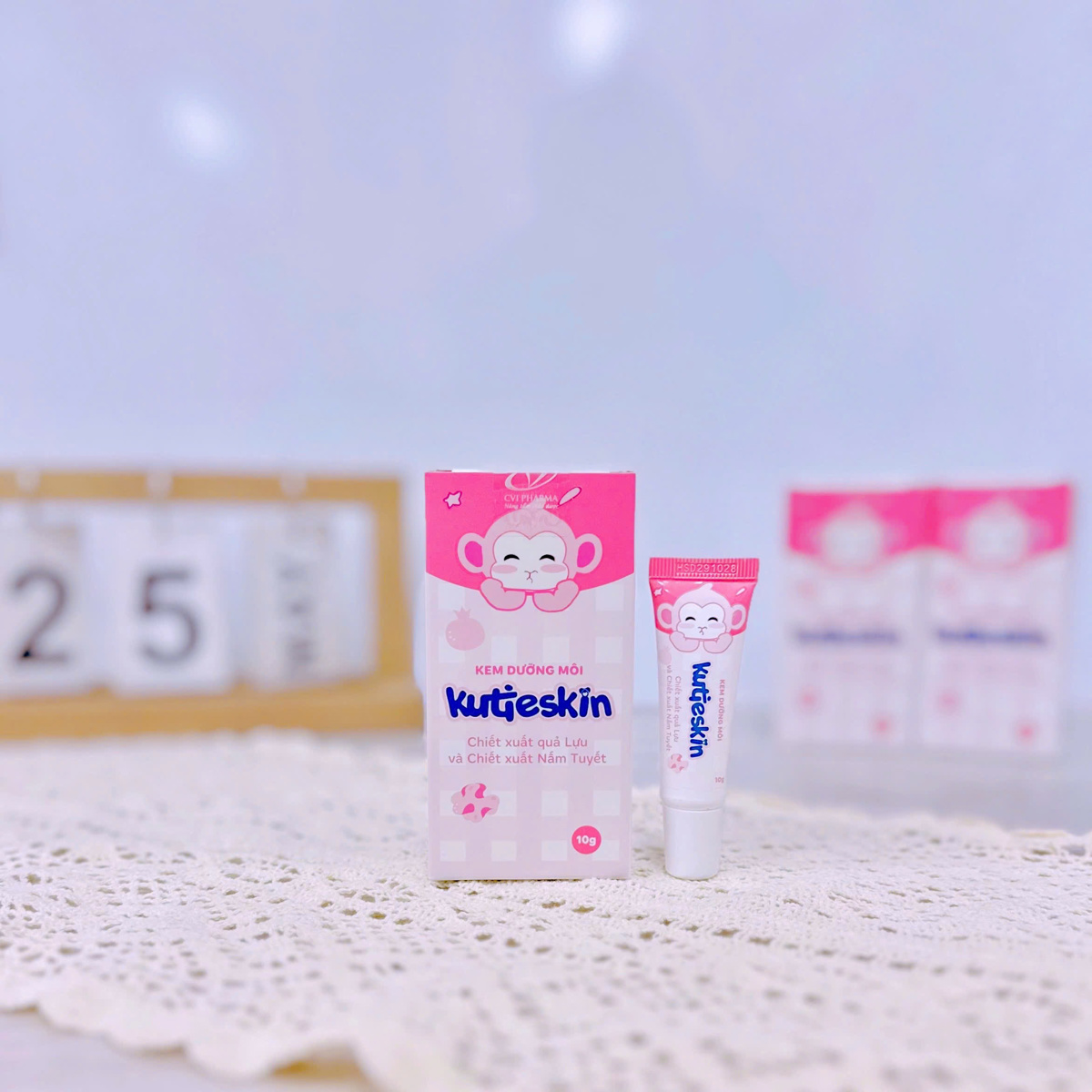 - Kem dưỡng môi Kutieskin giúp các bé vừa nuôi dưỡng, vừa bảo vệ da môi trước các tác nhân môi trường. Ưu điểm là cấp ẩm nhanh, dưỡng môi cả ngày mà không gây nặng môi, khó chịu.