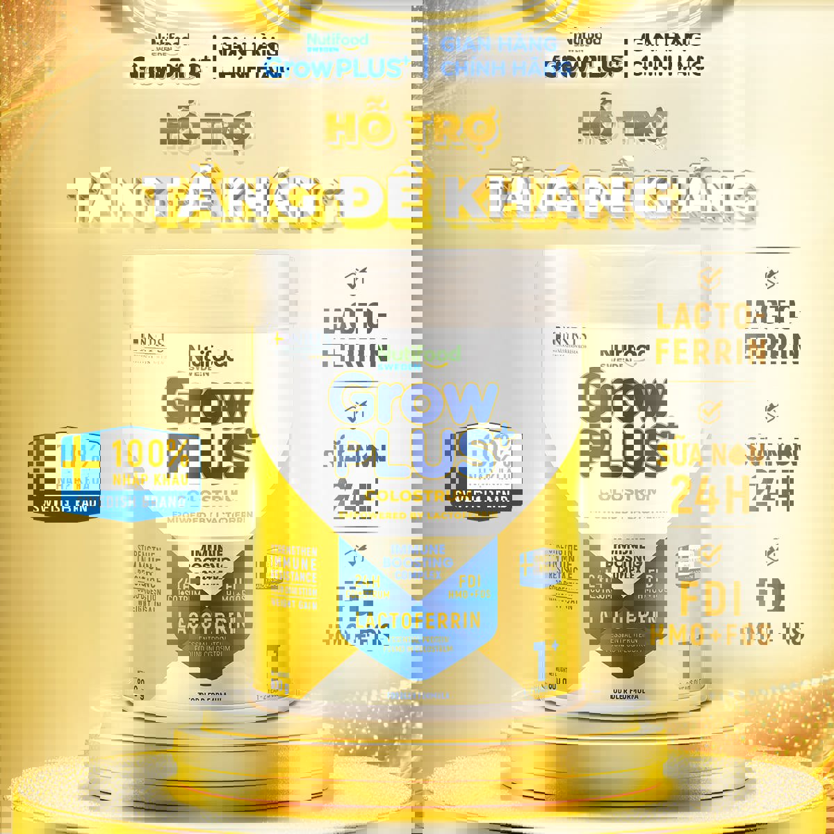 Công thức PHỨC HỢP TĂNG ĐỀ KHÁNG(1) là sự kết hợp của Sữa non 24h(2) chứa kháng thể IgG, tăng cường với Lactoferrin và 2′- FL HMO – FOS(3) giúp giảm vấn đề về hô hấp và tiêu hóa, hỗ trợ tăng cường đề kháng cho bé phát triển khỏe mạnh.